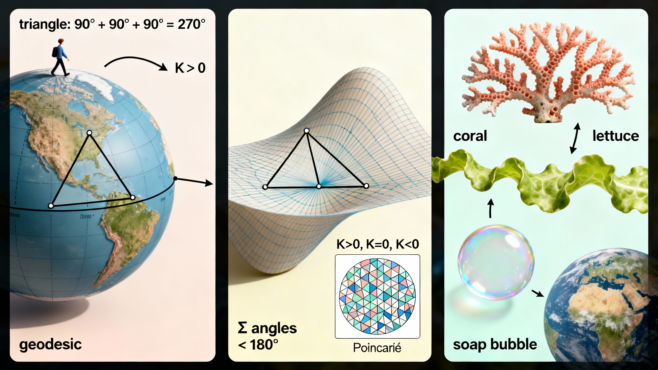 Представьте на мгновение, что вы — двумерное существо, живущее на поверхности сферы. Вы можете двигаться в любом направлении, измерять расстояния, строить фигуры. Но у вас нет никакого представления о третьем измерении. С вашей точки зрения, мир кажется бесконечным, потому что вы можете идти вечно, не достигая края. Однако если вы начнете строить большие треугольники и измерять их углы, вы обнаружите нечто странное: сумма углов всегда оказывается больше 180 градусов. Постепенно вы поймете, что ваш мир искривлен. Так начинается путешествие в геометрию искривленных пространств — миров, где интуиция подводит, а математика открывает истины, скрытые от непосредственного восприятия.