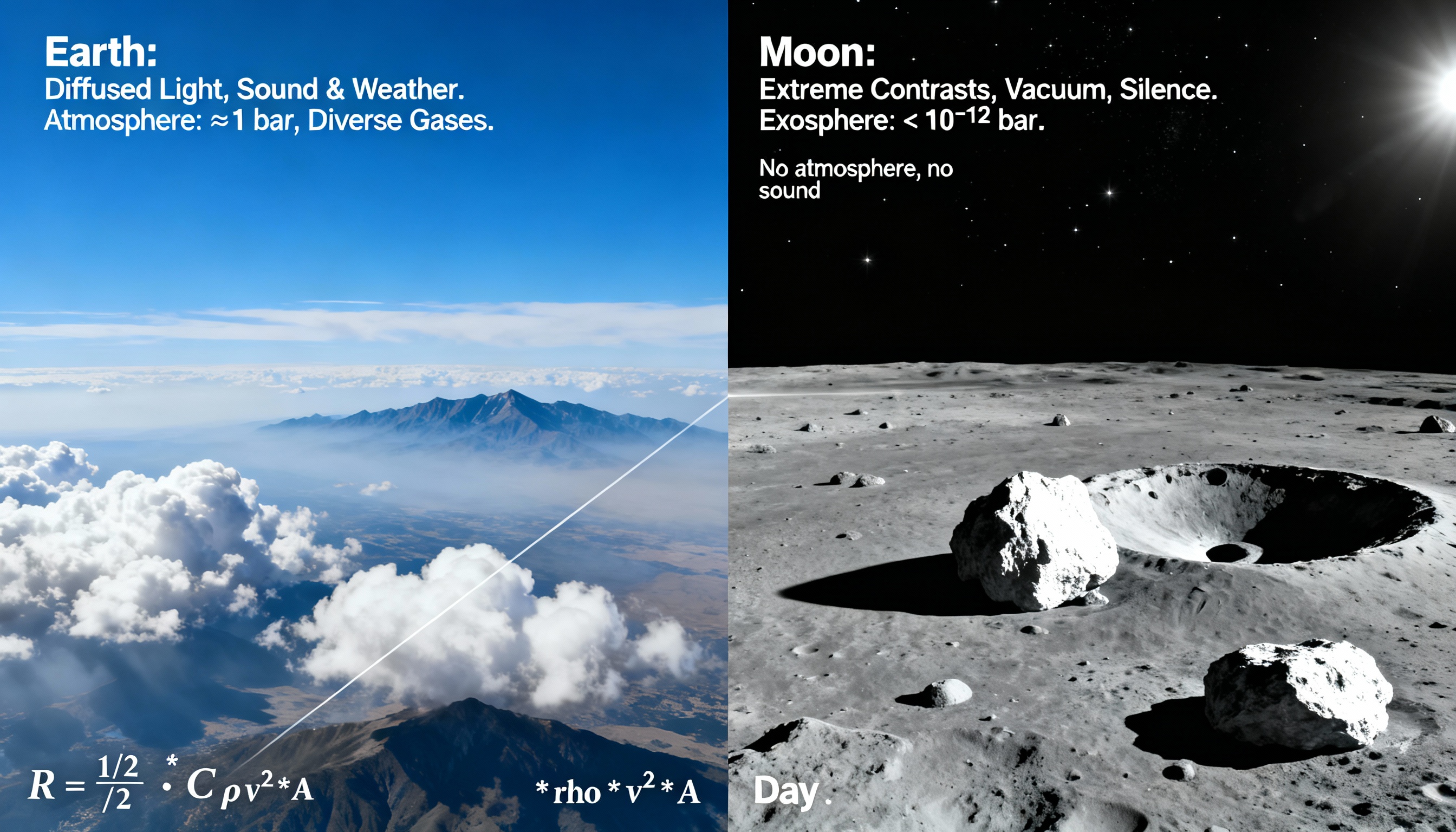 Когда Солнце встаёт, это происходит внезапно, заливая ландшафт ослепительной яркостью. Когда оно садится, поверхность мгновенно погружается во тьму. Эти резкие контрасты придают лунной среде её пронзительную красоту — место, где свет и тень сосуществуют без размытия.
