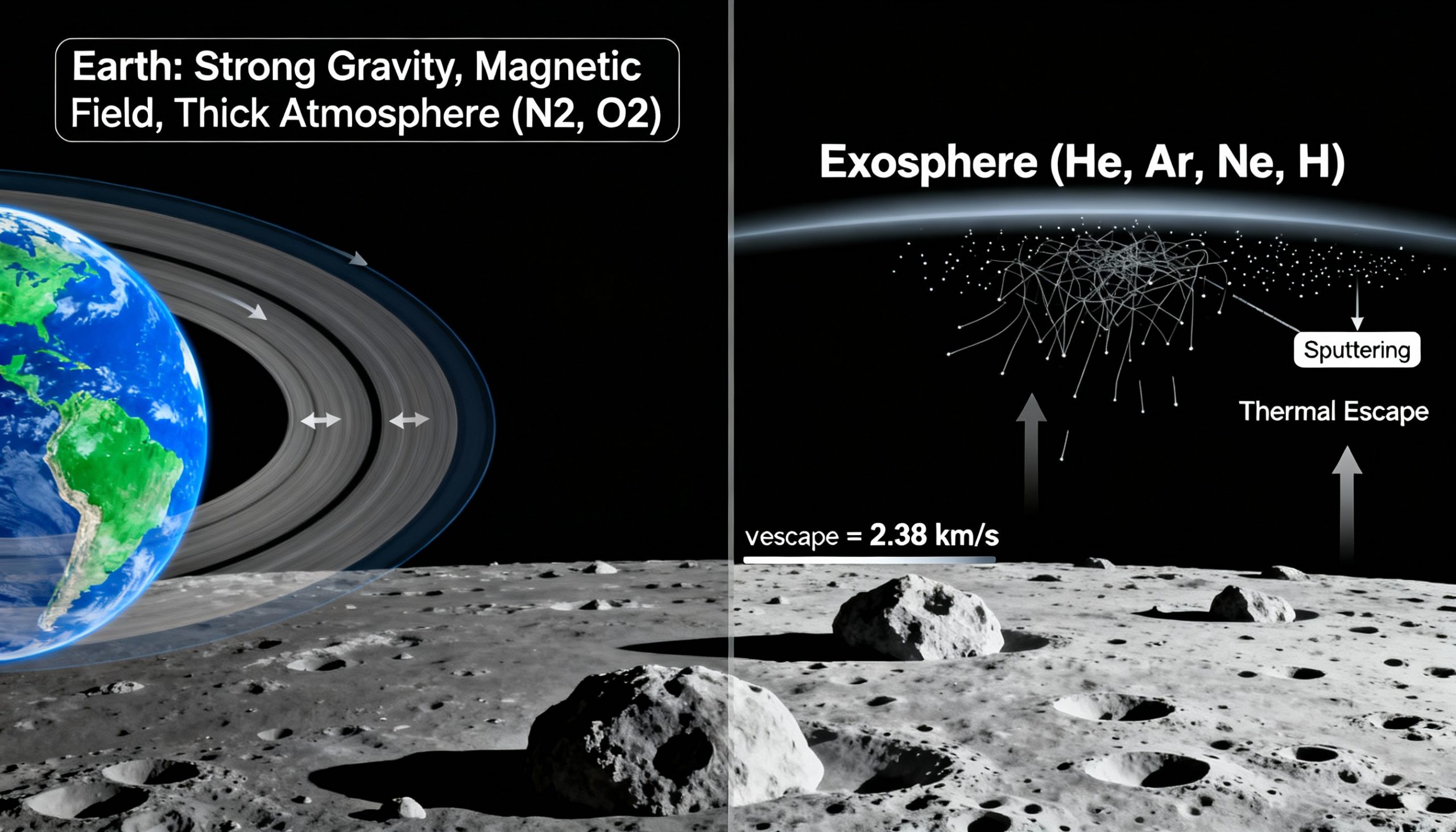 Земля, например, обладает достаточной массой для удержания лёгких газов, таких как азот и кислород, формируя толстое и защитное покрывало воздуха. Луна же — всего около 1/6 размера Земли и обладает гораздо более слабой гравитацией. Её скорость убегания — скорость, которую должна достичь частица, чтобы покинуть гравитационное влияние, — едва превышает 2 километра в секунду. При температурах, встречающихся вблизи лунной поверхности, атомы кислорода, водорода или гелия легко достигают или превышают эту скорость. И как только они это делают, они уходят навсегда.